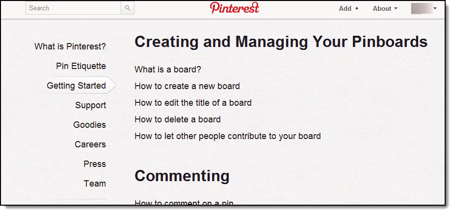 1. The basic Pinterest Help page, which goes through each process in simple tutorial format…